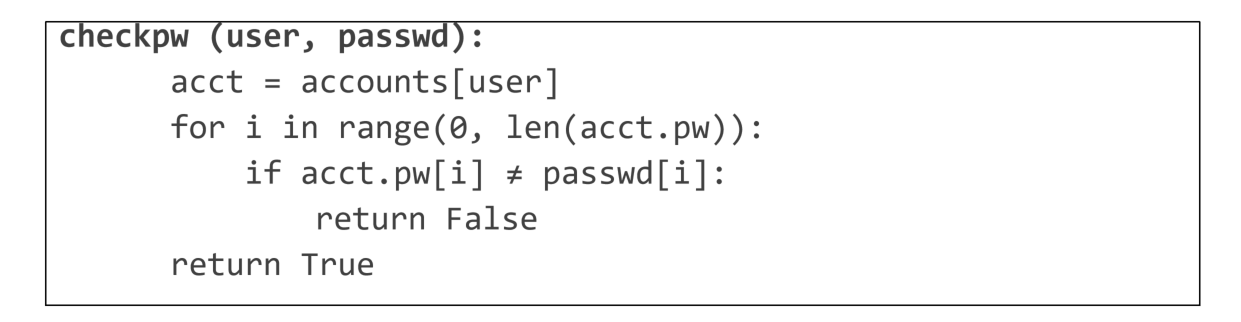 使用如下的检查密码算法有何问题?由于是逐位检查,因此可以在密码存放的方式做手脚,比如可以将密码的第一位和剩下的位数放在不同的页中,且让剩下的位数被换页到磁盘,那么就可以根据时间来判断第一位是不是对的,从而如法炮制试出每一位的正确字符