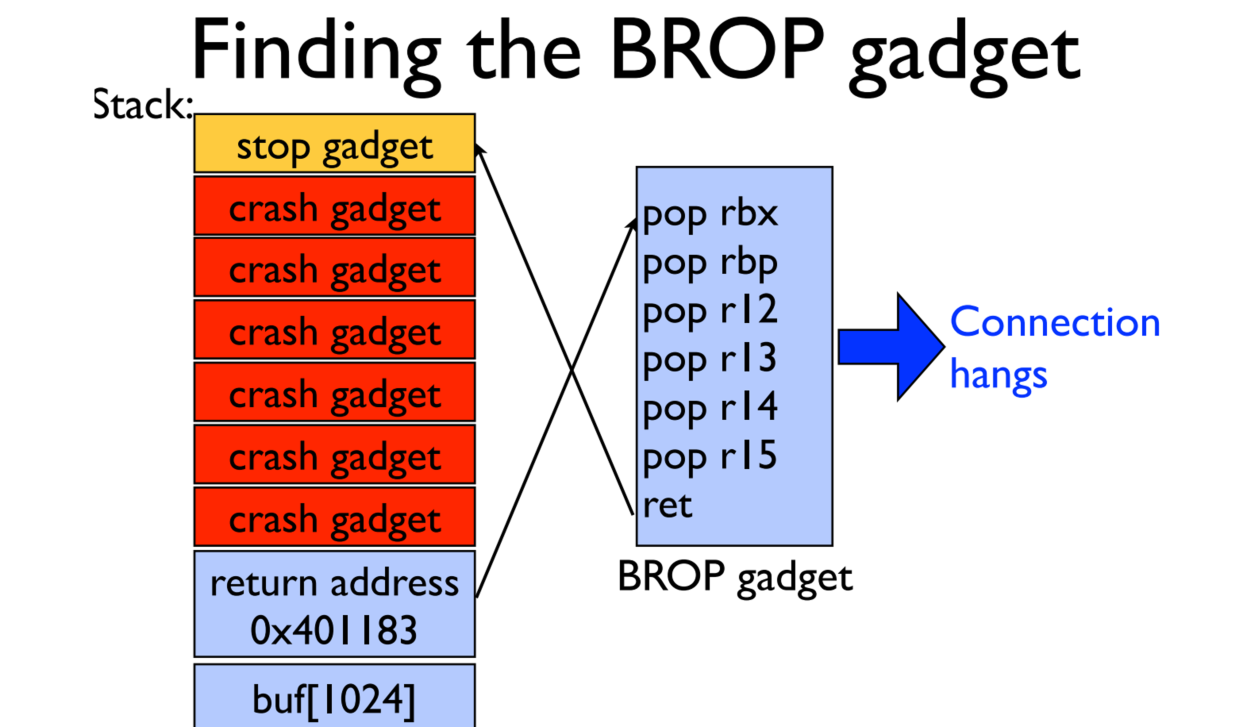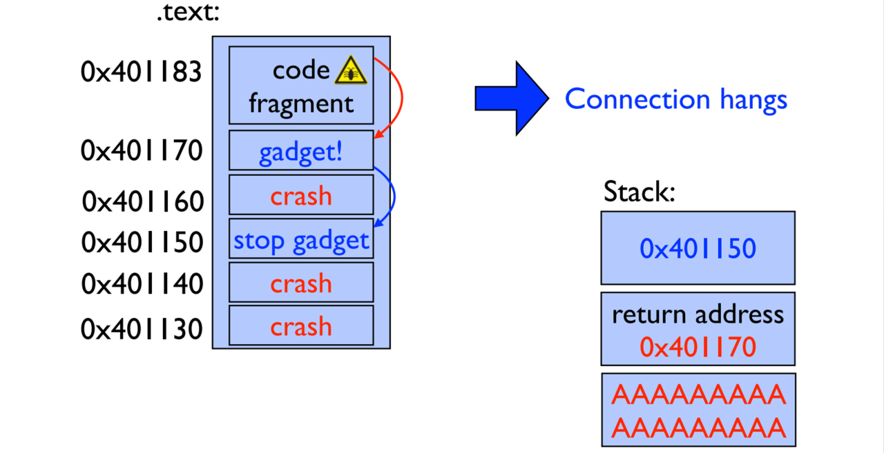 如何鉴别哪一个地址是useful gadget?可以在要检测的返回地址的更高层栈的返回地址插入已知的crash/hang返回地址,如果最终响应依赖于更高层插入的crash/hang,则可以说明当前测试的这个地址属于useful gadget,可以正常返回