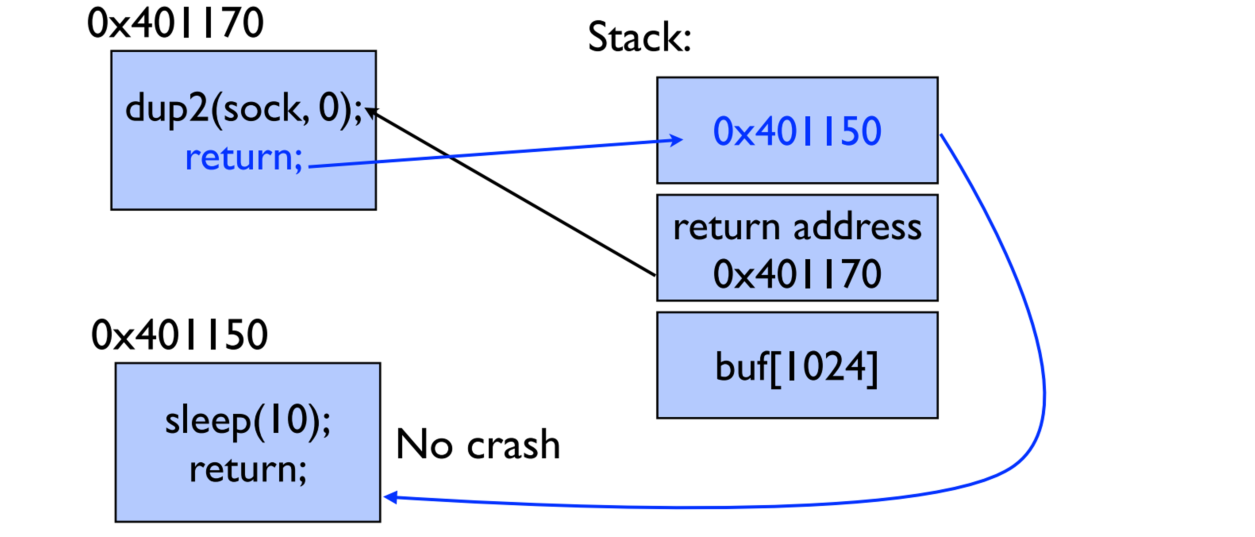 ret后执行攻击代码;可以通过限制可执行区域阻止,比如不允许执行属于栈的地址位置的指令 - 改写return addr以让其跳转到其他代码区域的部分指令,通过碎片化的跳转达到完成一整套攻击逻辑的流程(ICS lab3 final 5’);可以通过随机化栈偏移量(同时设置栈的一系列跳转为相对跳转)、在return addr处设置金丝雀值检测篡改return addr来阻止;不过fork出来的子进程是和父进程有一样的地址空间规划的,就没有达到随机化栈偏移量的作用