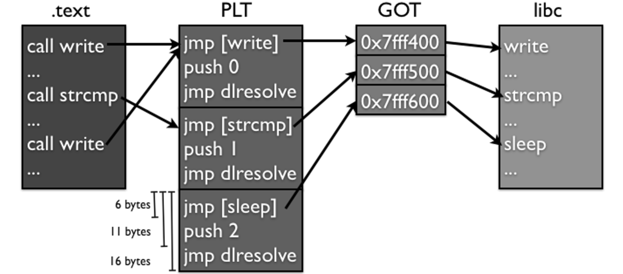 大部分的PLT项都不会因为传进来的参数的原因crash,因为它们很多都是系统调用,都会对参数进行检查,如果有错误会返回EFAULT而已,并不会造成进程crash。所以攻击者可以通过下面这个方法找到PLT:如果攻击者发现好多条连续的16个字节对齐的地址都不会造成进程crash,而且这些地址加6得到的地址也不会造成进程crash,那么很有可能这就是某个PLT对应的项了。