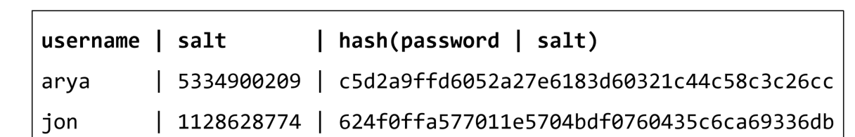 - 加盐(Salting):对每个用户存一个随机的加盐值,以及存哈希后的(加盐值+密码),这样即使被获取,攻击者也只能针对一个特定用户来进行密码的破解,因为两个用户即使密码一样,他们的加盐值也不一样