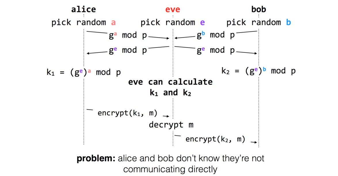 问题在于传递密钥的时候怎么知道对面真的是目标方,而不是别有用心者?如下图,该机制也可以正常运行,在交换密钥的时候双方并不知道中间隔了一个人!