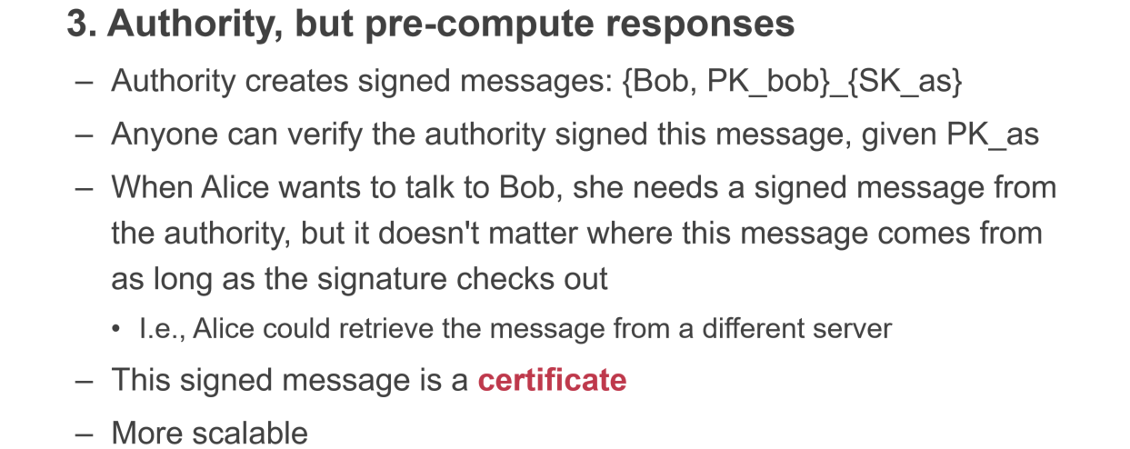 - one-time passwords:一次性密码,比如某个密码可以使用100次,那么第一次使用可以先在本地$hash^{99}$次,然后再在服务端进行hash后进行检验;随后用于检验的hash调用层数-1,这样即使攻击者获取到了$hash^{97}$的密码,也是无用的,因为这个密码已经失效了,而且很难$hash^{-1}$