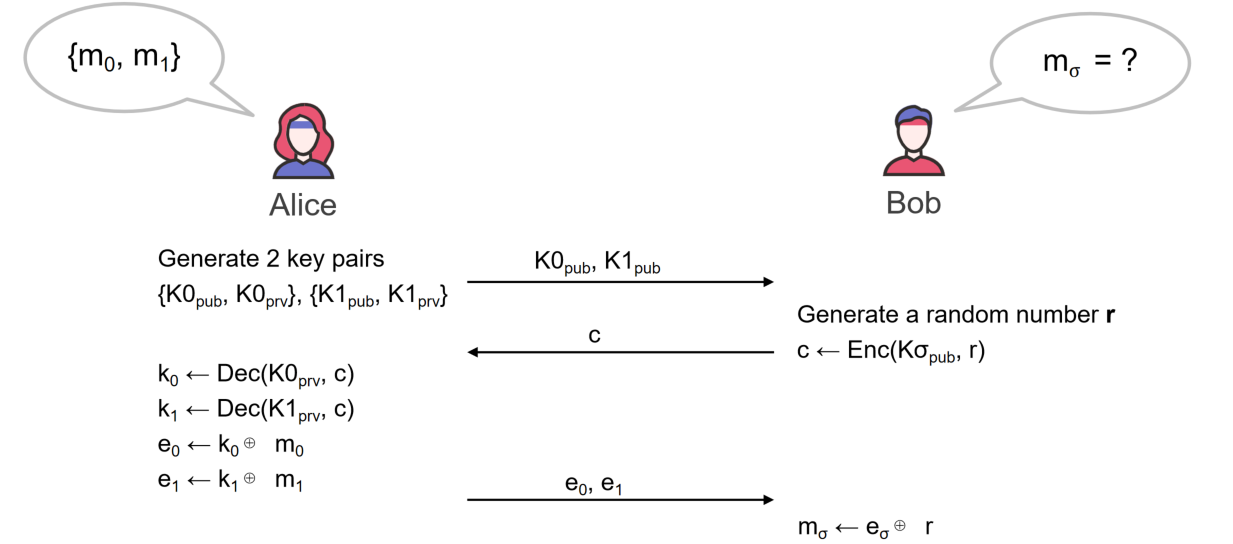 建立在一个前提:需求方不想让发送方知道自己想要什么,发送方也不希望让需求方得知额外的信息;发送方公开自己持有的所有信息的公钥,需求方根据自己的需要选择想要哪个公钥对应的数据来进行对随机数r的加密,而后发送方对于c进行解密,生成异或码;只有想要的数据才能被需求方翻译成真正的信息