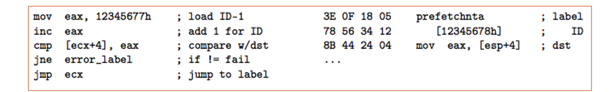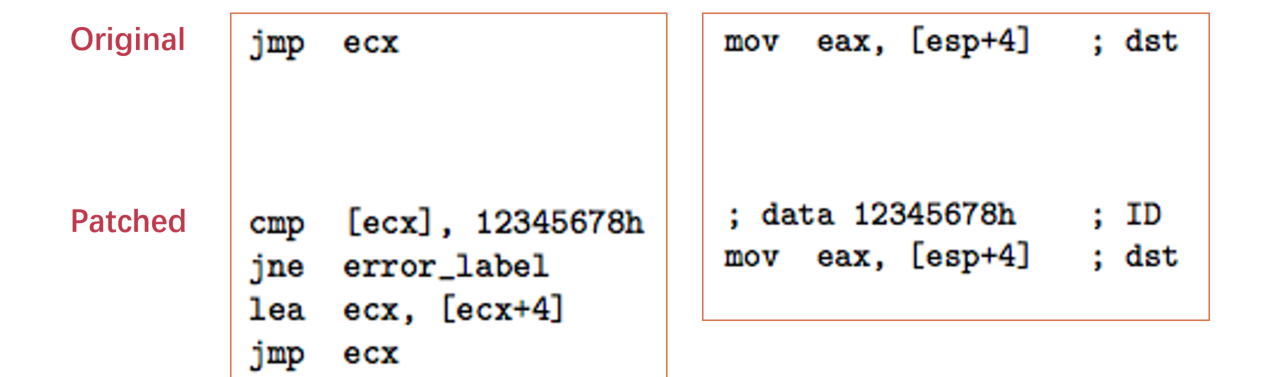 通过Patch提前添加比对信息,跳转方比对被跳转处的预设的数据是否符合预期,从而验证跳转的正确性;当然这存在一定问题:比如A在一个跳转语句中可能跳转到C/D,那么C/D处的验证数据就必须是一样的,因为这个A检查的是同一个数据,那么如果B能跳转到C,那么即使B在控制流图中没有与D的跳转关系,他被攻击后跳转到D也依然被认为是合法的;解决方法是增强CFI,增加条件使得不同的rax能够到达不同的jmp指令,从而使关联的粒度更细
