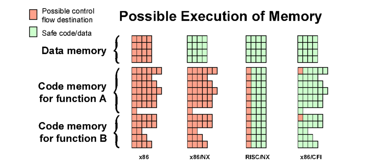 指令可执行区域的发展,RISC/NX表示指令对齐,从而只有32对齐的位置才被视为合法跳转地址,而X86/CFI的跳转控制流图依赖又大大加强了这一点