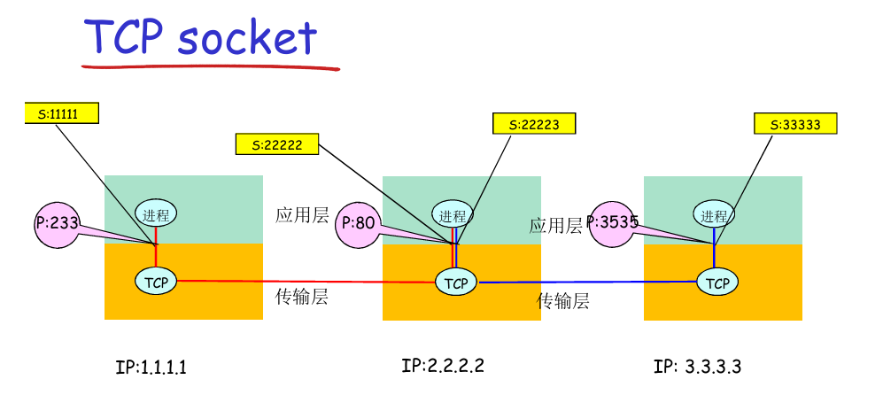 - 携带信息:要传输的报文SDU+传给谁和谁传的,应用层通过socket来标识通信的双方和单方,这样每次在socket传输报文的时候就不用携带那么多信息了