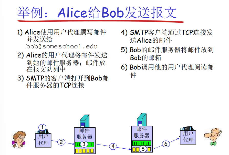 邮件服务器管理用户的邮箱和发送给其他邮件服务器的发送队列,用户将邮件发送给邮件服务器,邮件服务器将其传入队列中等待发出,对方邮件服务器将其传入对应用户的邮箱中,对应用户通过pull类型请求获取邮件(服务器之间的发送邮件无中转服务器)