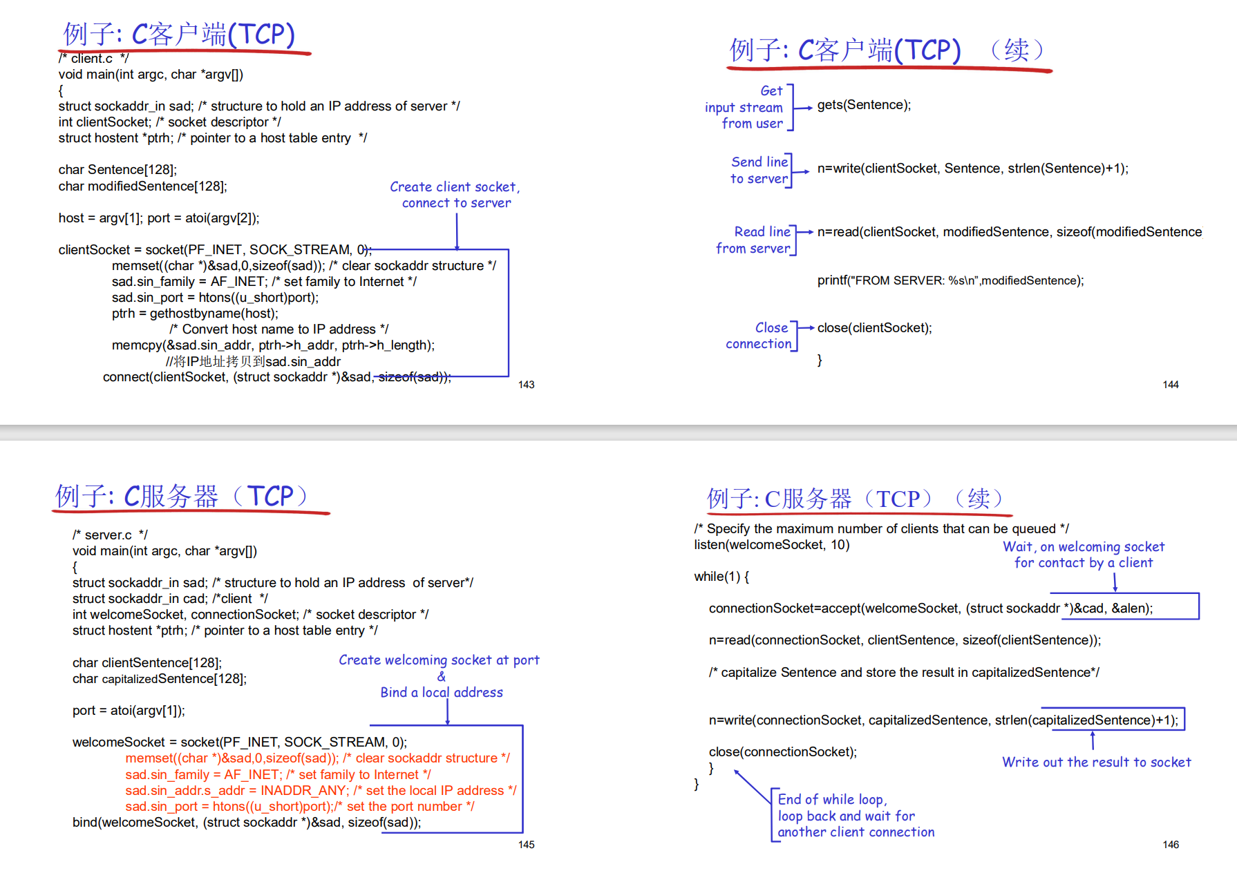 listen函数定义请求等待队列的长度,使用accept函数进行一个阻塞式的等待连接请求行为 - 客户端创建连接socket,隐式与本地端口捆绑(因为不是很重要),指定服务器的IP和port之后通过