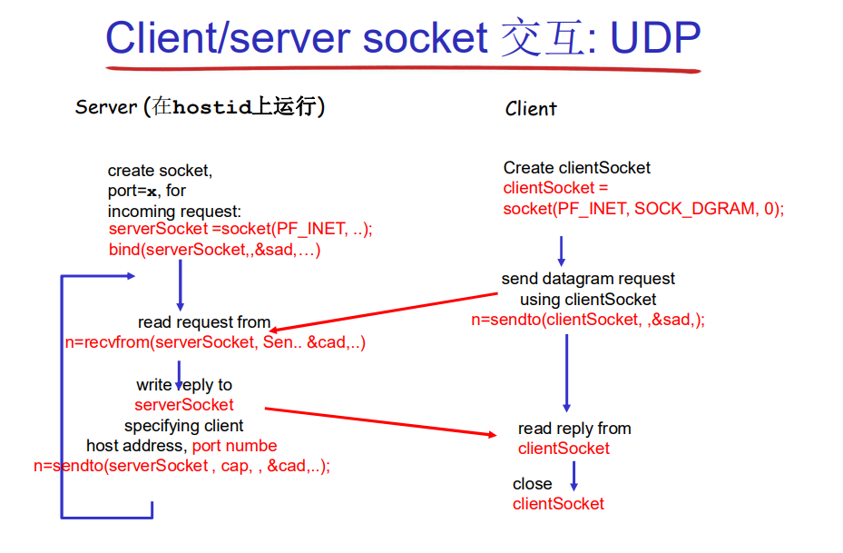 udp不需要建立连接,在编程上的体现是建立套接字后:客户端不需要connect函数而是直接sendto中传数据报datagram和服务端IP+port即可;服务端只需要recvfrom等待客户端发出来的东西并且保存其位置,随后将响应发给他就好