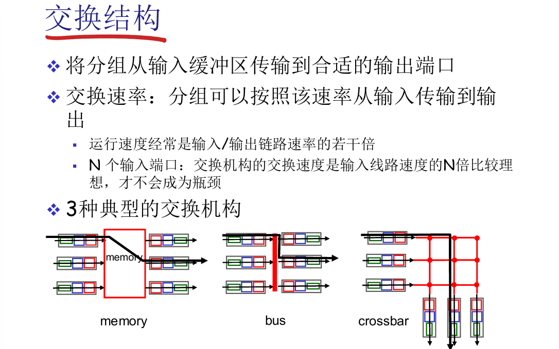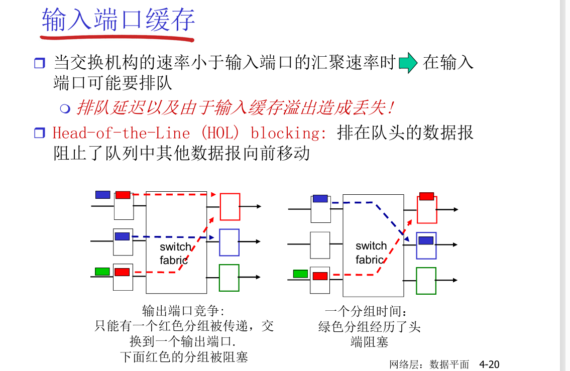 - 设置队列一般是为了防止输入端口传出数据时的排队等待导致数据链路层传来的数据丢失,一般传出输入端口的速率大于链路层传入网络层的速率