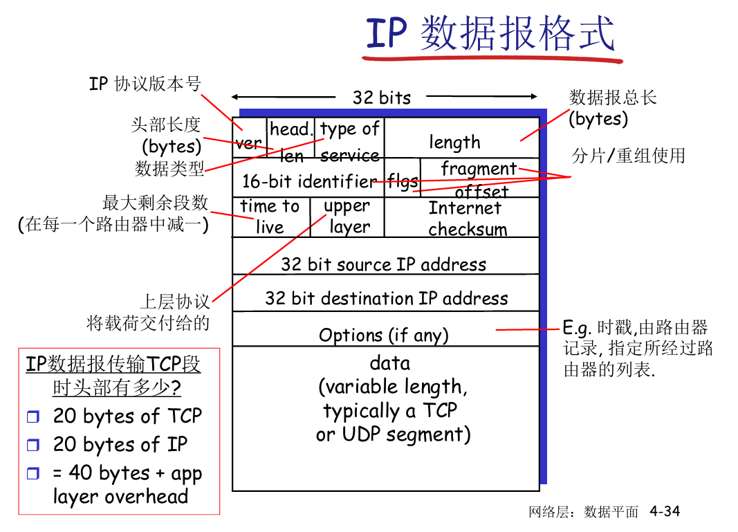 - 标识、标志、位偏移:由于各种链路支持的数据报大小不一致,因此可能会出现大数据报被迫拆成小数据报(称为片)的情况,需要用标识(identifier)来标记同属于一个源数据报、标志(flag)为0是末尾片为1是非末尾片、位偏移确定片在原数据报的偏移情况,这样可以可靠保序重组