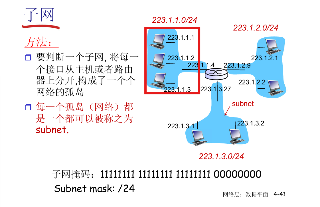 一个子网内的节点,它们的IP地址的高位部分相同,子网内各个主机无需路由器介入就可以在物理上互相直接到达,如下图的223.1.1.0/24就是一个子网地址