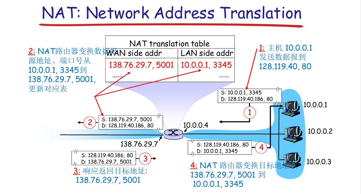 - 通过子网内主机IP和端口号,在对外路由上分配一个NAT转换表的表项,两者的IP和端口互相对应,方便进出对外路由的寻址