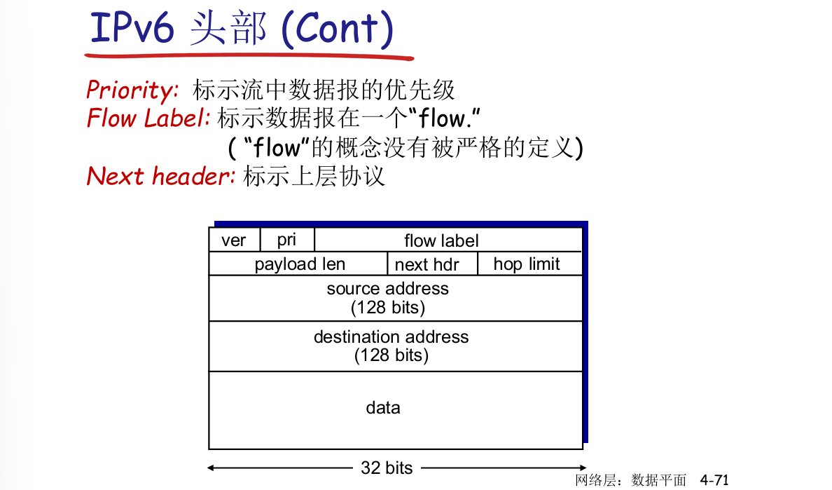 - 流量类型(pri):类似于IPv4的服务类型,标示这个报文是什么服务的