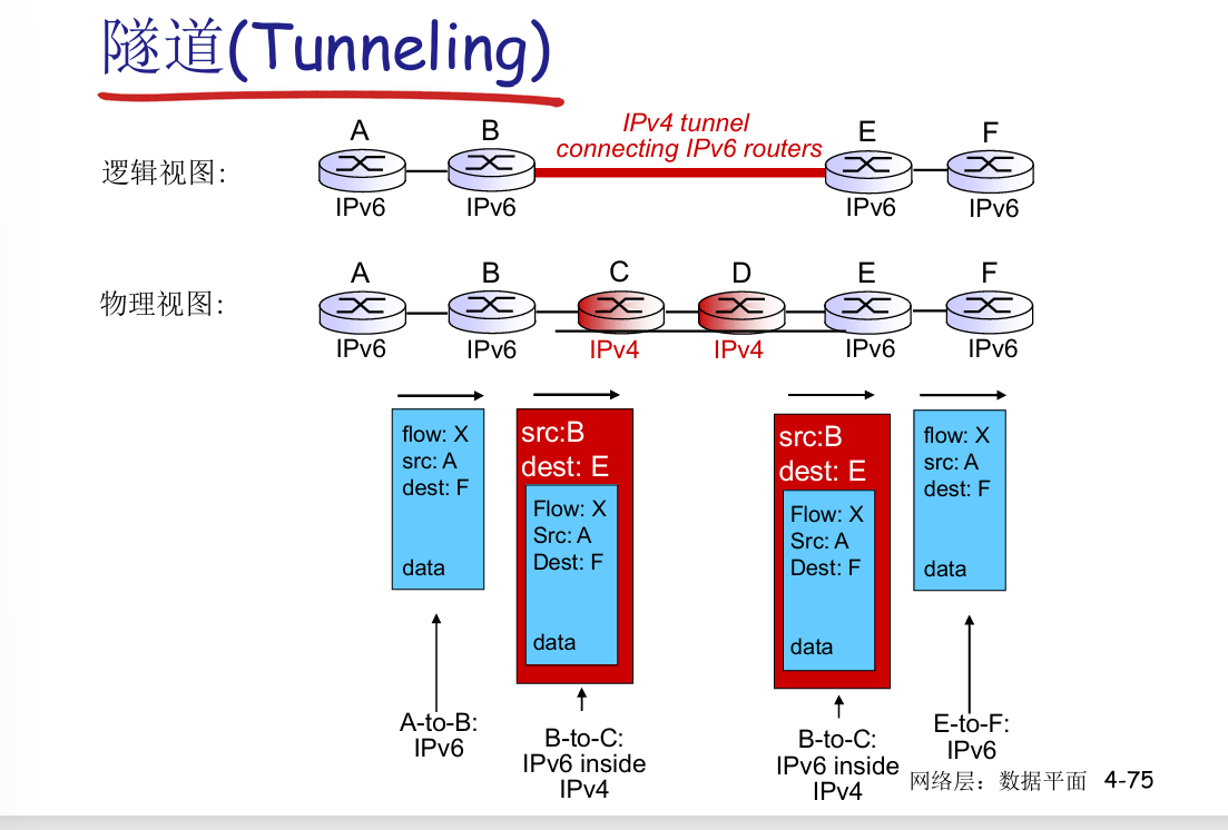 可以在有IPv4路由器的路径上,将带有IPv6的数据报封装为“数据”并添加IPv4的头,协议号字段设置为41表示该IPv4数据报的数据是一个IPv6数据报