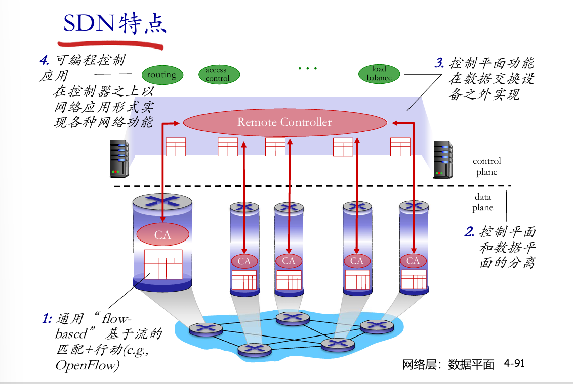 传统的控制平面是由路由器自己实现的,路由器会根据自己内部的算法来生成转发表,从而交给数据平面来转发;但是这样相当于控制平面和数据平面是高度耦合的,不利于更新换代
