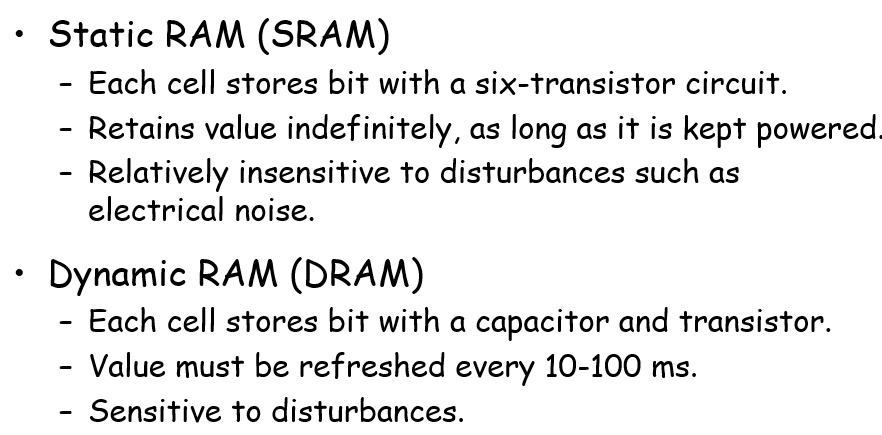 - SRAM:可以无限期地保持在两个不同的电压状态之一,只要有点,他就会永远保持它的值,当干扰消除的时候,电路会恢复到稳定值;用于缓存cache
