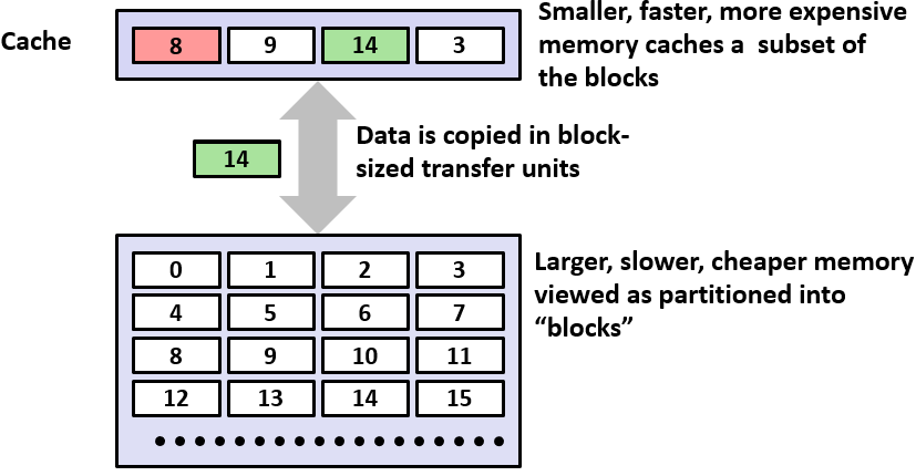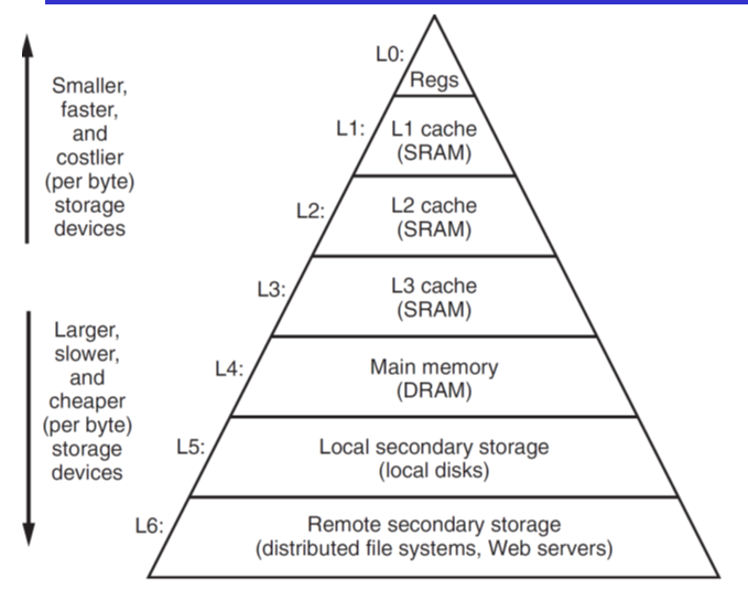 在大部分情况下,存储器层级结构是一个金字塔型的结构,数据多而访问时间慢的在底层,上一层是下一层的数据子集(在空间不紧张的时候是子集,如果空间紧张可能缓存从底层取出数据后,数据会被删掉,避免重复);上一层是下一层的子集