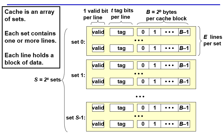 一个缓存有S个set,一个set有多个line,一个line内有一个valid位表示该数据是否有用、t个tag位标识数据、b个bit位用于存放数据