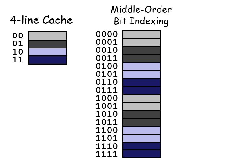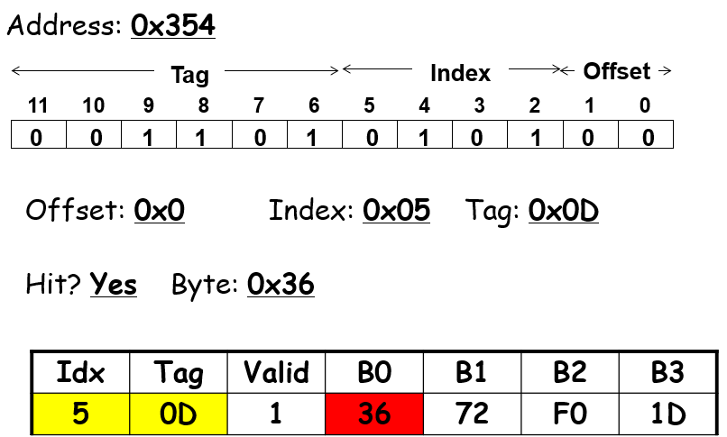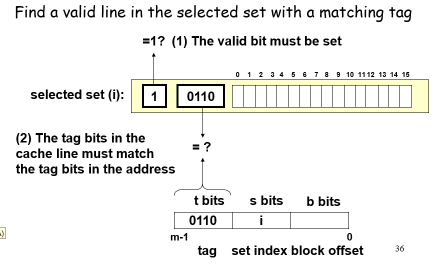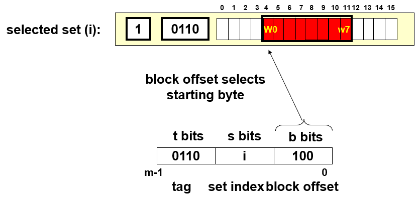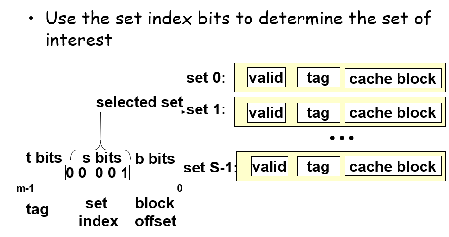 首先,一个地址数据会被分割成3个部分,$s=log_2S$表示的是数据可能会存在缓存中的第$s$组;从这些位获取到对应的组别后,通过tag位的一一对应关系来确定这个set里面包含的数据是否有这个地址所需要的数据;如果有则表示命中hit,会继续根据地址中的block offset偏移量来获取到对应line的cache block的某个位