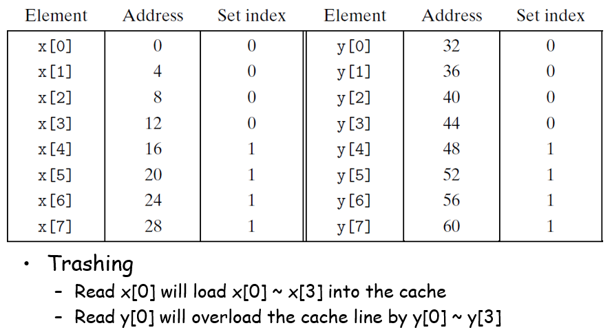 他这个的意思是说,如果一个块的大小为16字节,那么读x[0]会读到x[0]~x[3],但是紧接而来读y[0]又会因为冲突而复写set0对应的缓存数据,然后读x[1]的时候又冲突不命中了,依次循环往复,高速缓存形同虚设;一种解决办法是,给x开空间的时候开到x[12],但是这种方法比较反直觉