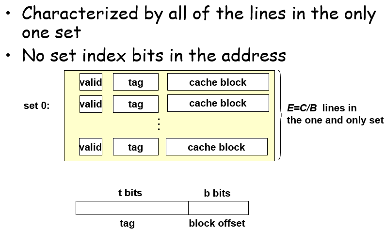 这种只有1个set的有效地避免了冲突不命中,对缓存空间利用率高;但是硬件实现较为困难,以及容量满了之后决定数据复写的位置需要一定设计