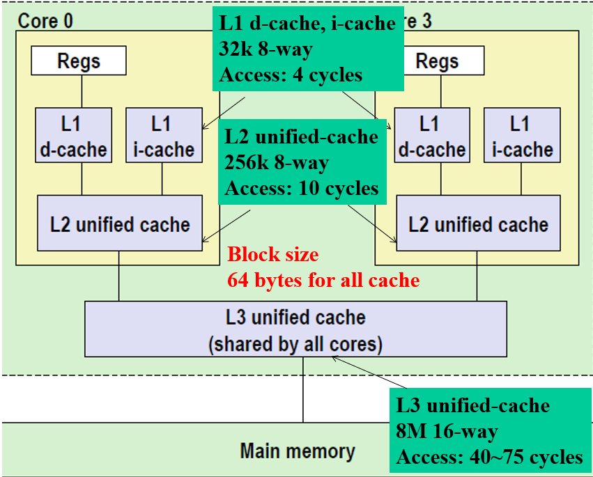 数据从上到下进行请求,如果缓存内有想要的数据,则缓存命中;反之为不命中,不命中有3种情况,冷不命中(缓存为空)、冲突不命中(基于缓存替代策略与数据存取顺序的冲突,导致每次都无法从缓存中得到想要的值:比如第一次取9,但缓存中为13,此时把13->9;第二次取13,但此时没有13,则9->13…依次往返)、容量不命中(由于总的数据存取范围大于缓存范围,必有不命中的情况)