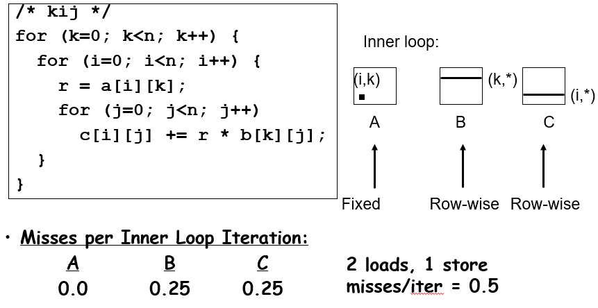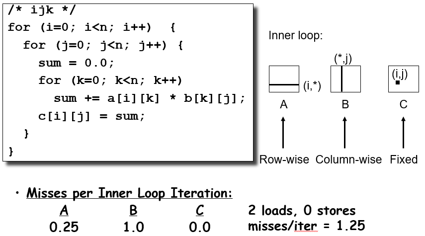 以矩阵乘法为例,b[k][j]的冲突不命中在n较大的时候非常明显,由于缓存中一个块顶多就64byte,对n>8就意味着每次都会冲突不命中,非常难绷