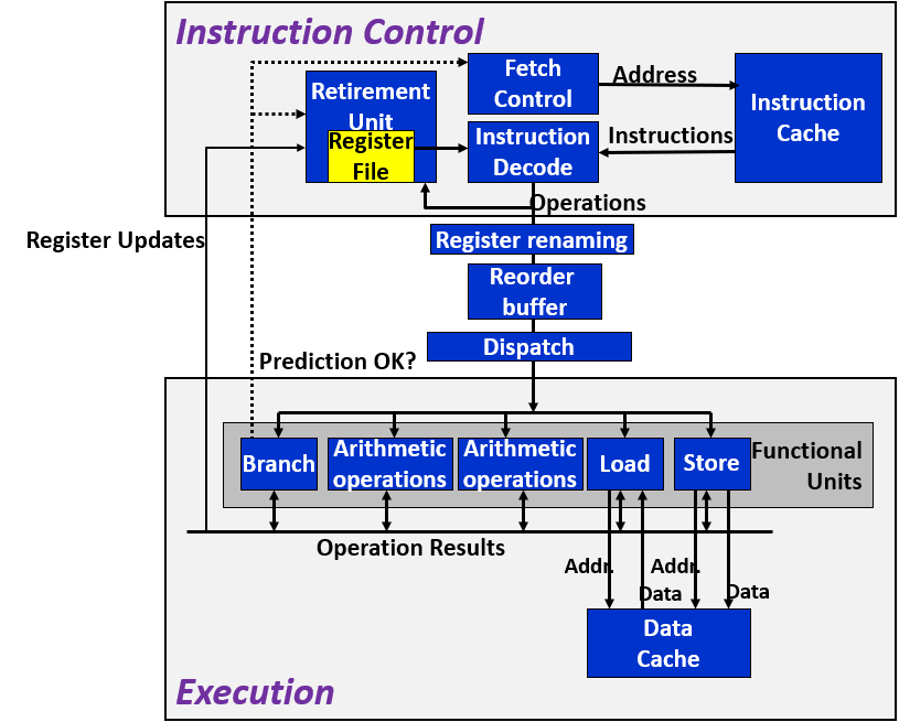 - retirement unit 退役单元:管理寄存器文件的更新,如果该指令遇到的分支都是正确的,而且其已经成功执行完毕,就会根据其结果修改寄存器的值;否则清空结果,不会对寄存器文件造成影响
