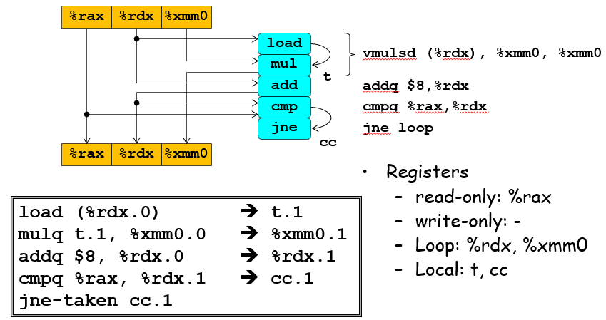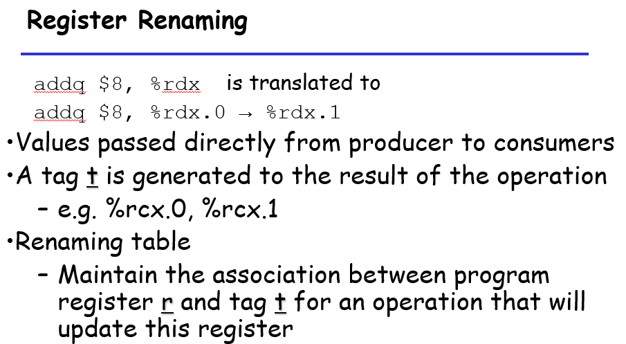 如果一个寄存器的值在一个指令序列中多次更改,则需要将其进行一系列的修改,而且为了区分老版本和新版本,需要对其进行重命名,具体来说不同阶段的寄存器如果被修改了值,就需要从%rax.0转变成%rax.1