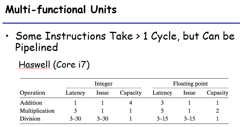 发射时间为1的功能单元被称为完全流水线化的,相当于一个时钟周期过后下一条指令又可以进入运行了;在这里发现除法器就需要等除法执行完成之后才可以执行下一条指令;另一个定义为最大吞吐量,是发射时间的倒数,处理器的吞吐量一般是capacity/issue