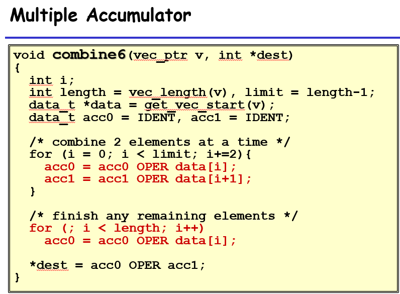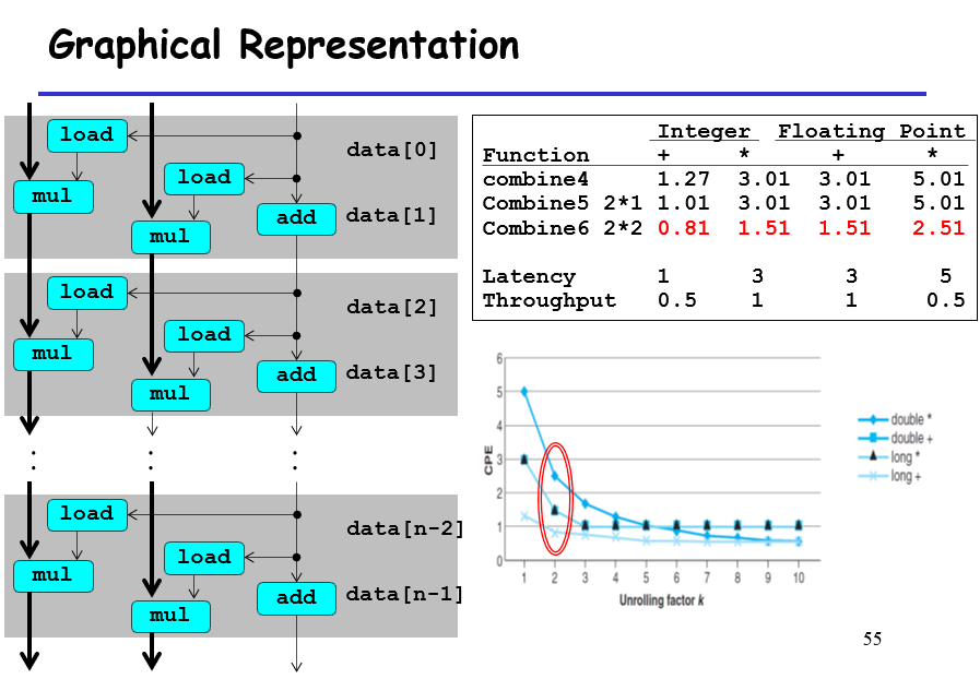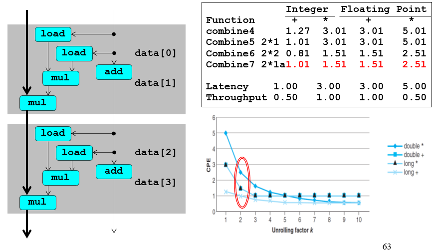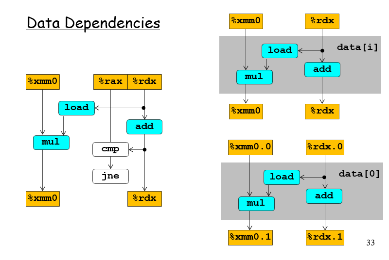 如果3这一条没被去掉,那么%rax是有前后依赖关系的,那么关键路径就是左边那一条;不过由于有load and store units,意味着s_data不需要写入load内,而是写到store unit里面,这样子对于%rax就没有依赖关系,这个过程中所有的%rax版本都会一次写完,赋予一个版本号,写入到先进先出的store unit,所以这里面实际上的关键路径是%rdx,%rax可以同步写完;也就是最后结果所看到的bound1、7的差距