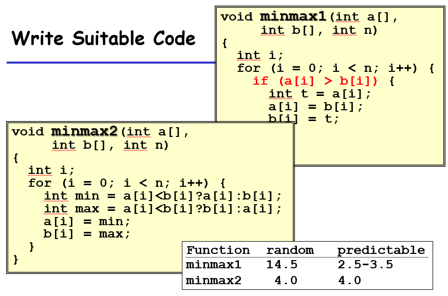 预测错误在现代处理器中会导致19个时钟周期的浪费,这对于我们编写具有高效率的代码也具有参考意义;如下,假设数据随机,则不使用分支跳转的代码运行时间更快(此处三目运算符使用的是cmov,相当于一个数电多路选择器,没有涉及分支预测,更没有失败惩罚);如果原数组相对比较有序,则使用分支预测则相当于减了一部分操作,提高效率