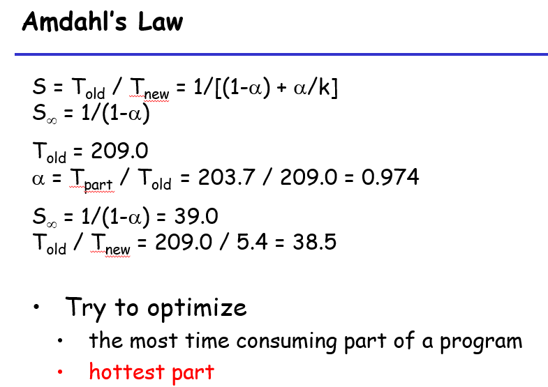 看起来好像很高端,实际上他想说的是,找到当前程序中耗时最大一部分(在目前的策略为函数),然后对齐进行优化;若当前最大时长函数运行时间占总运行时间之比为$\alpha$,那么先对其进行优化,优化了$k$倍就会让性能优化到原来的$1/((1-\alpha)+\alpha/k)$,对吧?所以优先对占比最大的部分进行优化,才能提高优化的上限