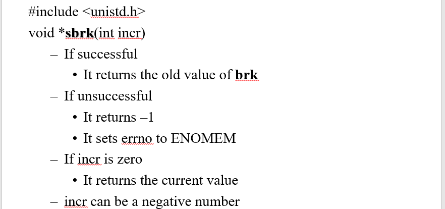 拓展堆区空间的函数sbrk(int),如果开空间成功,返回原来的栈顶(堆区空间的可伸长的末尾),参数可以为负,表示收缩空间