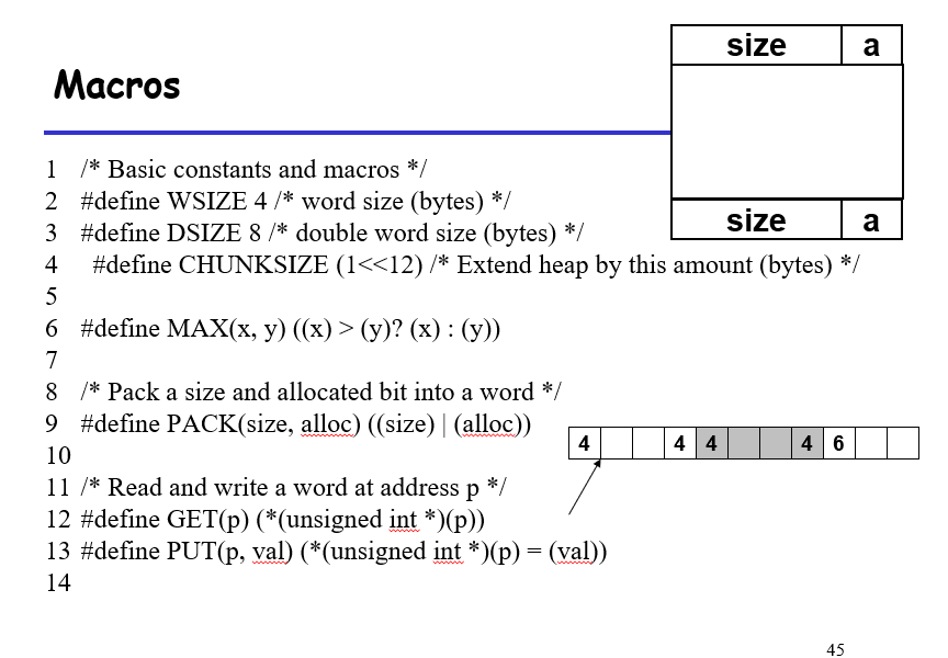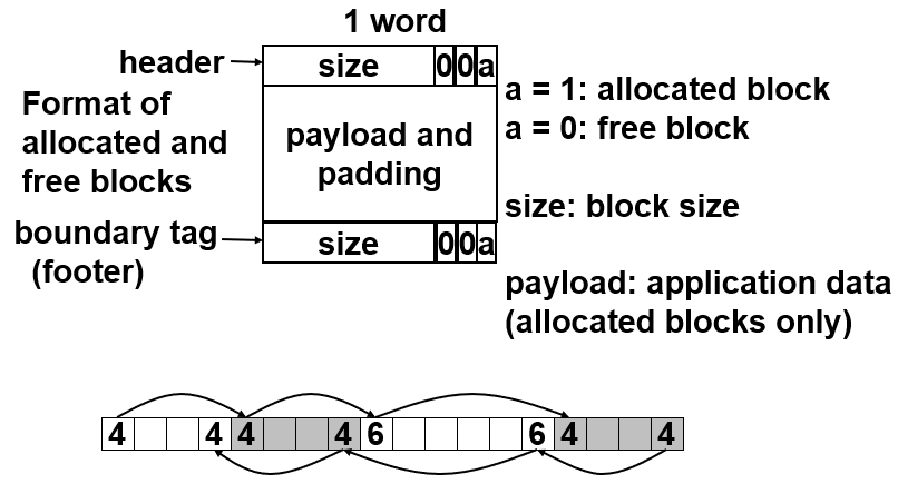 - 在数据块之前/之后加4byte用来存放size和a(是否空闲)的信息;注意size是整个块的size,单位是bit,这样用来标识这个数据块的大小
