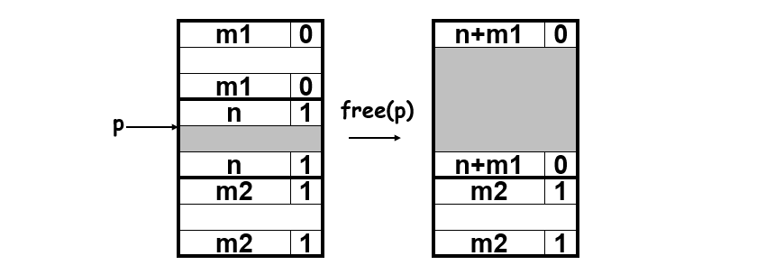 - 每次使用的时候都通过头尾标记来合并可以合并的空闲空间