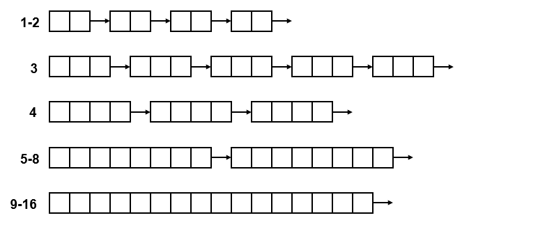 将相同大小区间的空闲块连到一起,组成若干个链表;分配任务的时候可以直接选到对应链表的表头进行分配即可。但是这个方式还是有可能造成一定的内部碎片,比如长度为10的需求分配了长度为16的空间