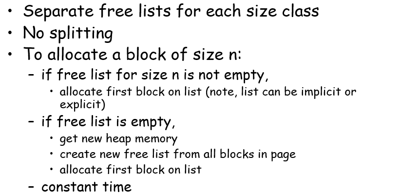 为了解决内部碎片的问题,有一种叫做Segregated Fits的策略,其支持在分配空间过大的时候去将未用到的空间插入到对应区间的链表中