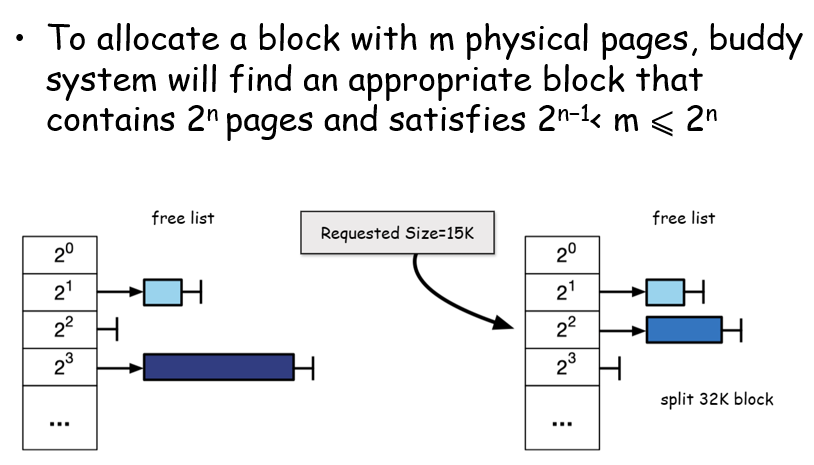每个块的大小为2的次方,具体来说,如果需要存15KB的数据,那么会先去向上取整,比如16KB,取到最近的、大于自身的2的次方;然后如果取到的是32KB,那么就需要将其分成2个16KB,给一个16KB给他;这个被分配的16KB如果被释放了,那么其会和自己原来的配对(如果此时配对空闲)合并成更大的空间块,依次递归