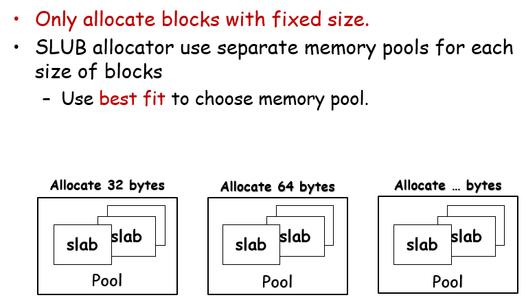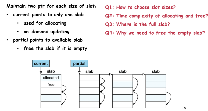 这里每个slab的大小也是固定的,这意味这,假设每个slab的大小都是2MB,那么每个slab的起始地址都是2MB的倍数;每个pool内会有一个current slab,用来响应当前要分配的请求;而每个pool维护了一个链表,名为partial,维护半空的slab;全满的不维护、全空的直接释放。