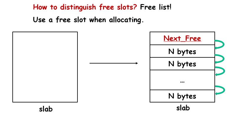 回收的步骤是:在free(p)处传入的是一个指针,那么首先会释放这个指针的地址所在区间,然后对这个地址去零头,找到自己属于哪一个slab(向下取整找到最近的2MB的倍数),然后就知道自己存储的Next_Free,以及自己这个slab存的数据块大小了,这样就可以准确地去释放正确数量的空间,同时将Next_Free的指针给新的空闲区域,而新的空闲区域地址被存到Next_Free里面