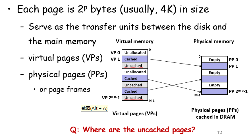 - uncached 可能被分配到物理地址空间的虚拟地址页,但是尚未分配,会指向一个暂存内存数据的磁盘空间