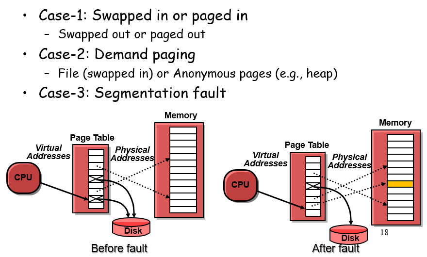找不到会发生page fault,发一个signal,请求内核将disk的内容放到memory,然后再次运行这个程序(的出现错误的这一行);当然也有可能直接SegFault