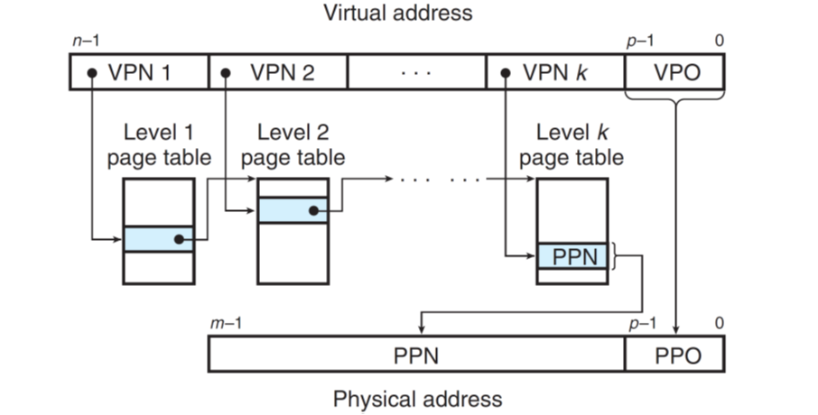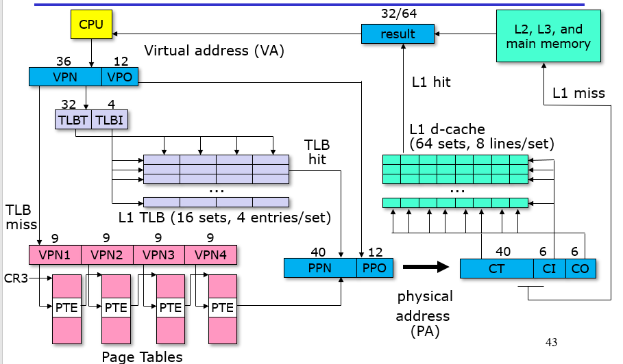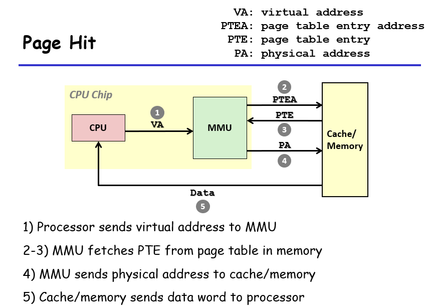 如下图,如果没有命中,会报缺页错误(chp8有提及),随后根据其类型来将磁盘内容放到内存的一个页或者直接segfault