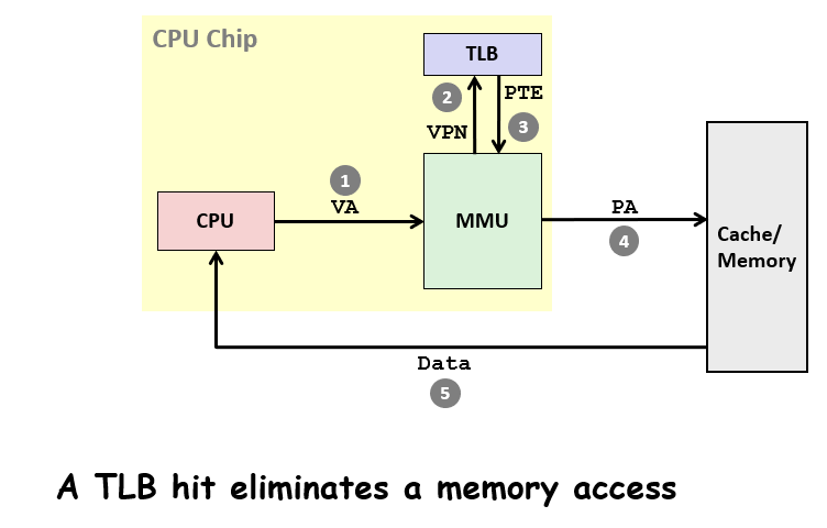 如果每次MMU都从内存去获取PTEA,那么太慢了,对于PTE的获取也是有类似于缓存的机制,被称为TLB(Translation Lookaside Buffer),如图,先从TLB中尝试获取已经缓存的PTE,若无才会去内存中寻找(寻找到了会使用类似于LRU的替代方法来对TLB的部分进行替代)