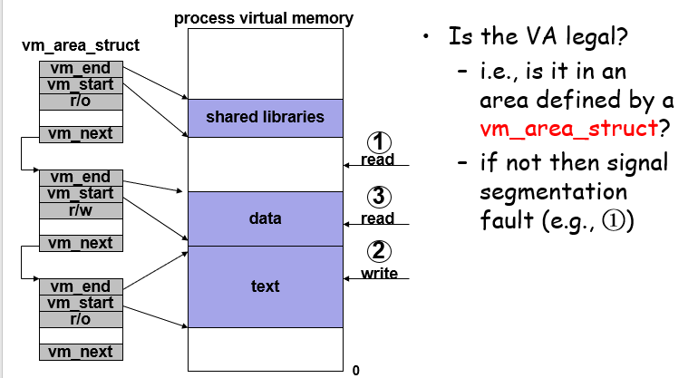 Linux会给每个进程维护一个vm_area_struct,这个结构会管理所有有效的(not unallocated)虚拟地址块,pgd是CR3存储的页表基地址,CR2寄存器会存储翻译错误的地址,留待翻译使用;给定一个虚拟地址,如果不是有效空间直接SegFault,或者权限有问题也不能访问成功