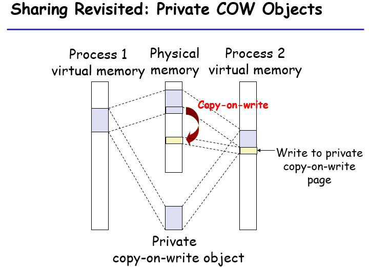 共享对象可以被多个进程共享,但是有些时候不希望因为共享的写导致程序执行不符合预期,所以对这类对象可以引入一个Copy on Write的标记: