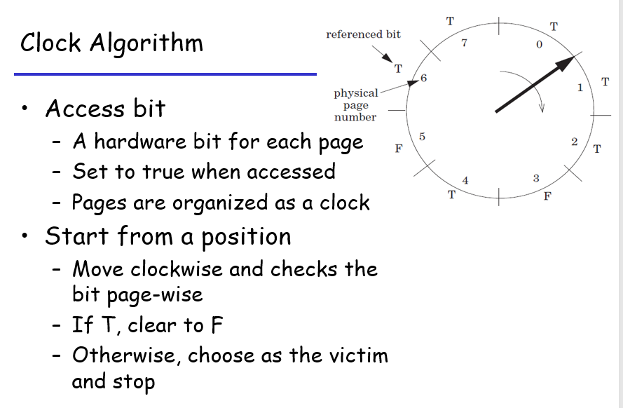 如果严格地实现LRU,那么记录时间戳在物理硬件上不太现实,而且也显得耗费计算资源,所以计算机学者设计了一个阉割版的Clock Algorithm,具体的运行形式如下: